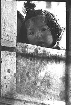 I took this photo near Puno, Peru. The young girl looking in at me through the broken window is strapped to her mother's back.